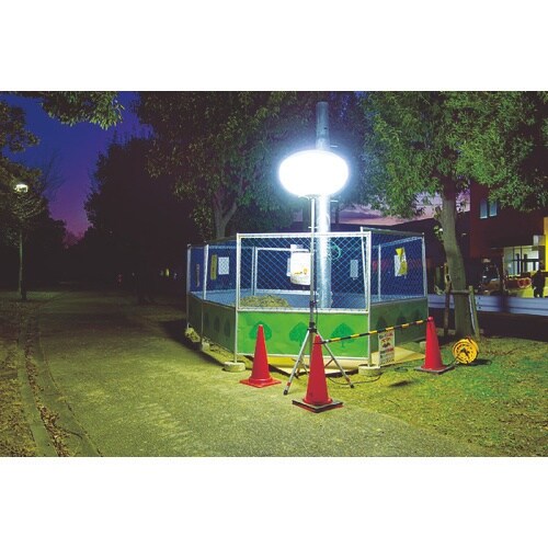 光源が従来のメタルハライドランプからLEDになり、省エネとなり環境に優しく経済的です。メタルハライドランプ400Wと比べて同等の明るさですが、約44%の消費電力削減です。夜間現場、災害時の照明として。 |