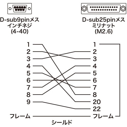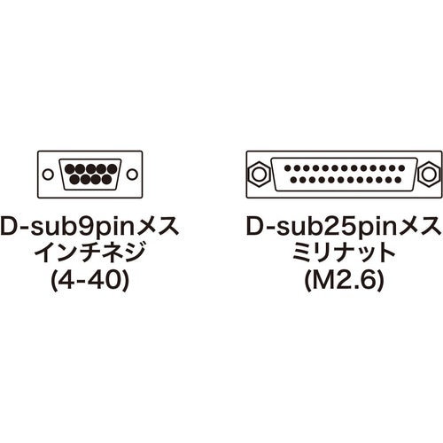 RS−232C変換アダプタ・ケーブルです。DOS/Vパソコンのシリアルポート(D−sub9pinオス)をD−sub25pinメスに変換するケーブルです。 |