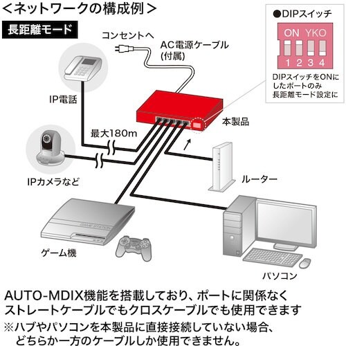 ギガビット、PoE給電対応の5ポートスイッチングハブです。1ー4ポートはPoE出力に対応、5ポートはPoE出力非対応のアップリンクポートです。 |