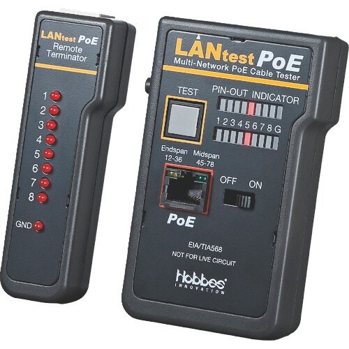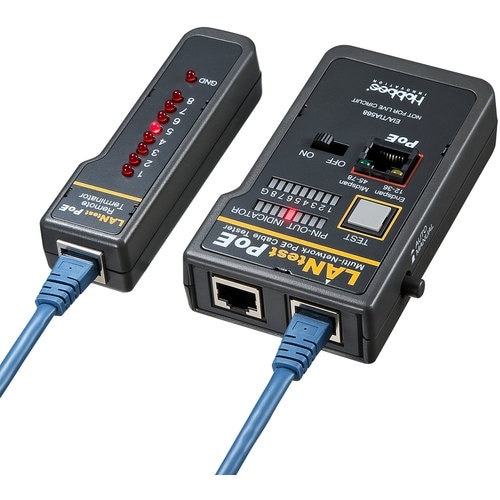ケーブルの導通・断線・結線ミスが簡単にわかる、PoE対応のLANケーブルテスターです。PoEの有無を数秒で確認できます。 |