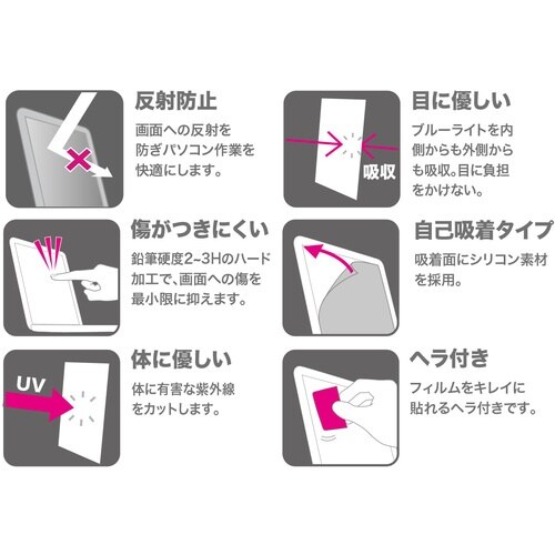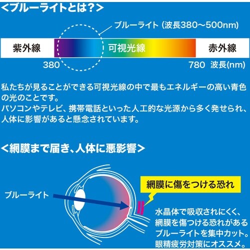 21.5型ワイド対応ブルーライトカット液晶保護指紋反射防止フィルムです。LEDバックモニターのブルーライトメイン波長450nmにおいて、約26%カットします。 |