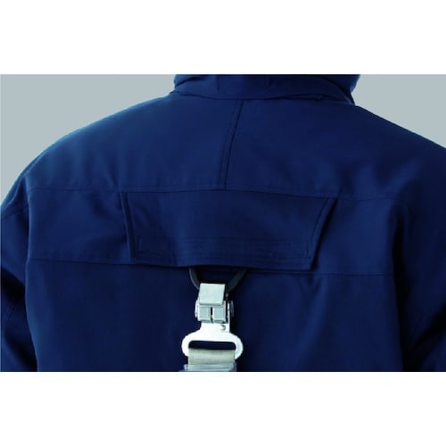 フルハーネス対応の防寒着です。胸ベルトを通すハーネススリット、肩の内側にはハーネスを固定するタブ、背中にはランヤードを通す穴があります。フルハーネス使用時の防寒対策に。 |