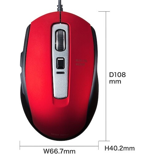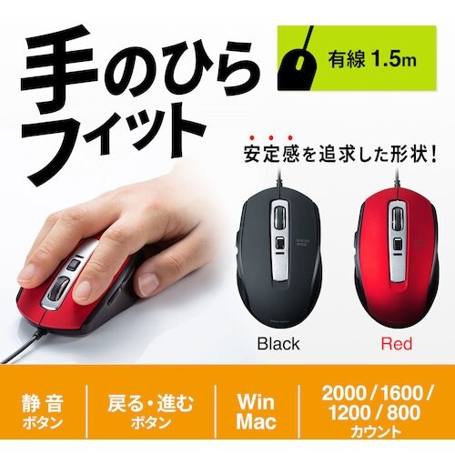 手のひらにフィットする形状の有線マウスです。マウスポインタを動かさず手元のサイドボタンで操作できる「戻る・進む」の2ボタンを搭載しており、Webブラウザで操作を スピーディに行えます。 |