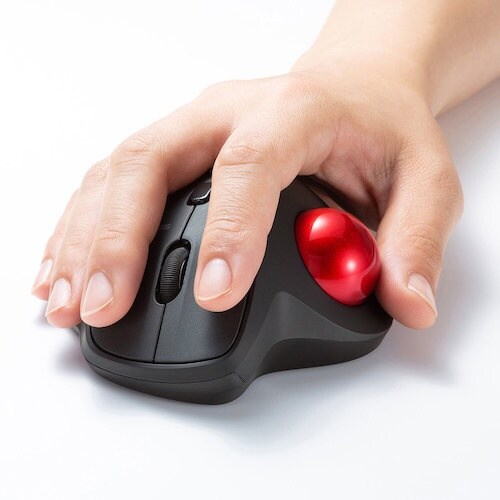 指でボールを転がしてカーソルを操作する、トラックボールです。力まずリラックスした状態で使用できる、親指操作タイプです。手のひらを軽く添えるだけでフィットするエルゴノミクス形状です。