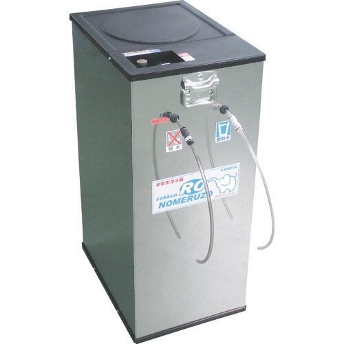 RO逆浸透膜使用でほとんどの水を安全な飲料水に浄水します。手動蓄圧タンク方式で常時加圧不要です。原水を入れてポンプするだけの簡単操作です。災害などの断水時に。 |