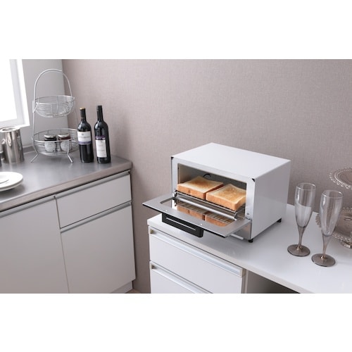 ミラーガラス調でキッチンやお部屋に馴染むインテリア性の高いデザイントースターです。横型は出し入れしやすいフラットタイプ、せり出す焼き網構造で奥の調理物も取り出しやすいです。 |