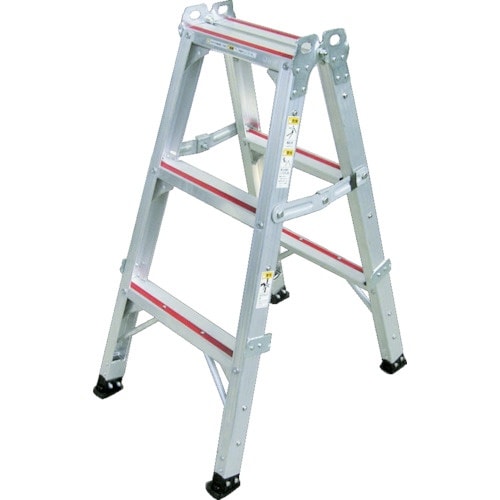 強さ、安全性、作業性、保管性、4つの機能を兼ね備えた脚立です。赤いすべり止めモールが、すべりや踏み外しを防ぎます。天板およびステップには60mmの幅広タイプ+樹脂のすべり止めモール付です。