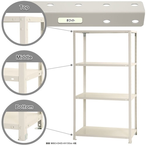 間口(mm):800 | 奥行(mm):400 | 高さ(mm):1500 | 色:ホワイト | 棚段数(段):4 | 均等積載量(kg・段):40 …