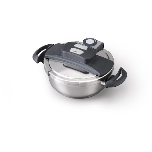 料理に応じて低圧・高圧の切り替えが簡単にできるダイアル式の両手圧力鍋です。圧力の状態が一目でわかる圧力表示付きです。ふたはボタンを押すだけのワンタッチ開閉です。 |