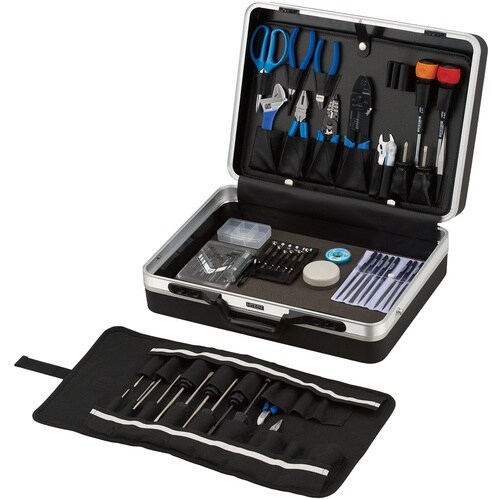テスター・スプレー・手袋などの収納スペースがあります。ハンダ付けを必要とする出張修理などに最適な工具セットです。フィールドエンジニア用工具セット。 |
