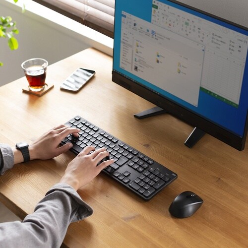 ■従来のメンブレンキーボードと比較しキータッチ音が格段に小さい静音タイプです。■パソコンやスマートフォンなど、Bluetoothを内蔵した機器とレシーバー無しで接続できます。 |