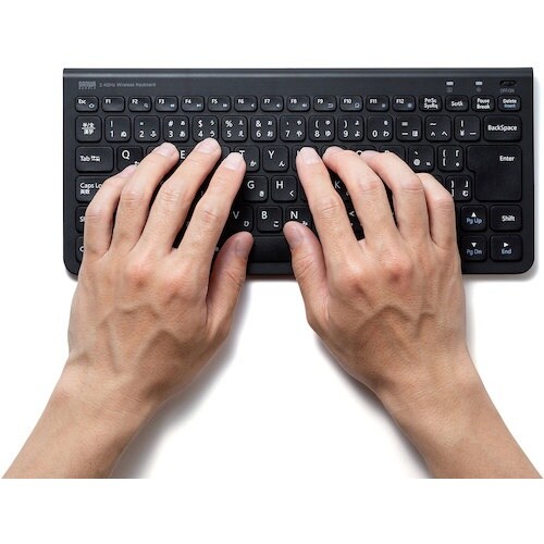 電波の到達距離の長い、周波数「2.4GHz」ワイヤレス設計です。最大10m離れた場所からでも動作可能です。最薄部6mmの超薄型形状です。最厚部でも14.4mmで持ち運びや収納に便利です。 |