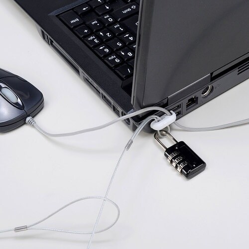 ノートパソコンのセキュリティロット専用、マウス・テンキーなども同時に盗難防止します。小型の取付部品でスマートに設置できます。セキュリティスロット専用です。 |