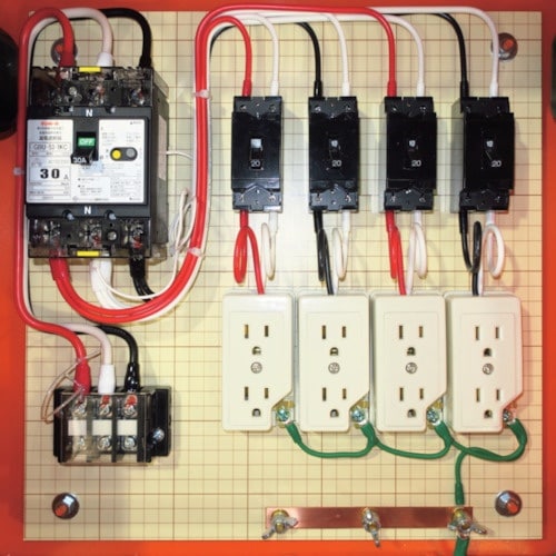 仮設電灯分電盤の標準型です。大阪府の自社工場で設計、製造しています。部分的な修正・変更から、フルオーダーまで、別作対応可です。工事現場のコンセント、照明や工具等の電源に。 |