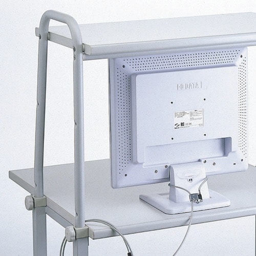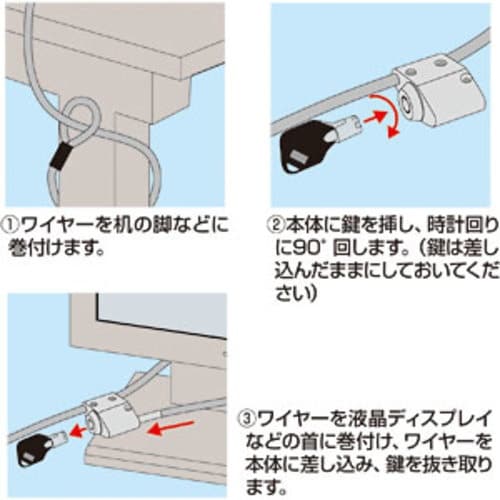 液晶の首部分に取付けです。軽量で高価な液晶ディスプレイを盗難から守ります。机などの固定物にワイヤーを結び、液晶ディスプレイの首部分に施錠をします。 |
