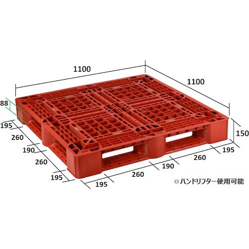 平置き段積み用の軽量パレットです。用途に応じて色分けするのに最適です。HACCP、GMPなどにも最適です。カートンP函の均等積み付け時1t。平置き、段積み用。用途別管理に最適。 |