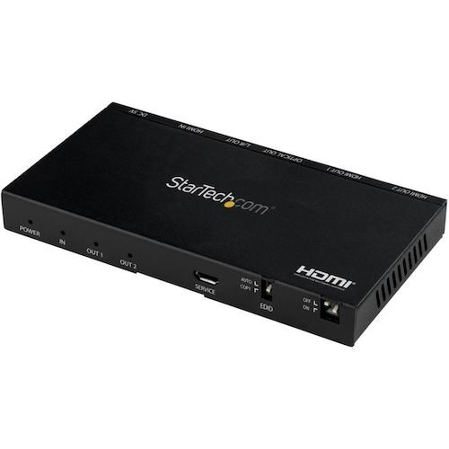 4K HDMIと7.1ch音声を分岐して2画面に表示します。内蔵のスケーラーで2つの解像度を出力可能です。 |