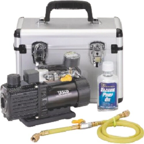 エアコンの新規据付に便利なセットです。真空ゲージキットを接続した状態で真空ポンプケースに収納できます。 |