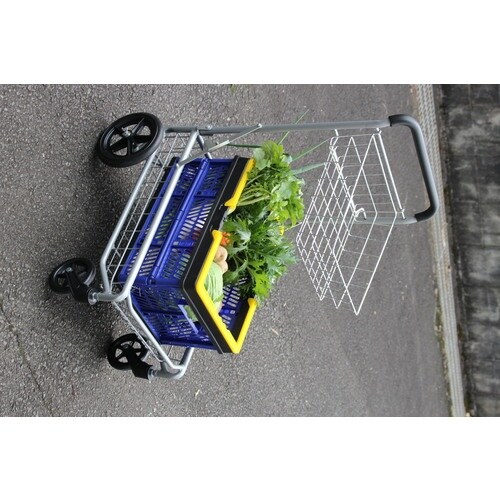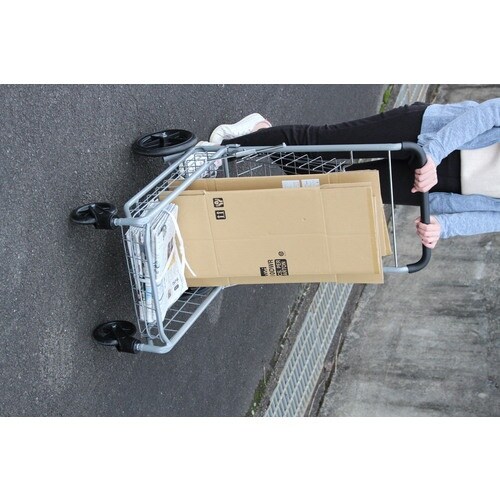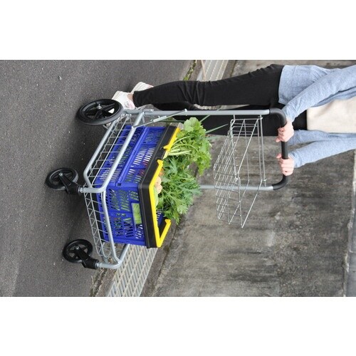便利なカゴが2段ついた、プッシュ式キャリーカート。ビッグサイズの後輪と、360°回転する前輪で方向転換もスムーズです。 |