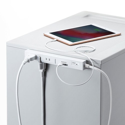 3Pプラグも差し込めるスリムタイプのマグネット付きタップです。上面&側面交互差込口レイアウトでACアダプタ接続に便利なスリムタイオプの電源タップです。