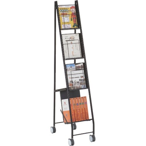 A4判幅広に対応しています。前受が高いため、パンフレットが腰折れすることがありません。ブックラックが最下段にあるため、分厚い書籍や予備のカタログをストックできます。折り畳み式なので、組立が不要です。 |