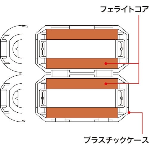 高周波吸収特性により、ケーブルにのる高周波ノイズを吸収しクリーンな信号電送を実現します。プラスチックケースにフェライトコアが一体化されている構造にため、ワンタッチケーブルに取り付けることができます。