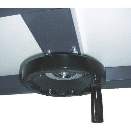 ハンドル操作で4脚すべてに内蔵された昇降装置が、同時に稼働し任意の高さ(700ー900mm)に設定できます。下横桟は使用状況に応じて3ヵ所の位置変更が可能です。大物、小物の組み立て作業の多くある職場。 |
