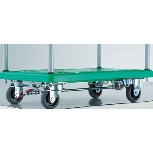 リング状の金具で自在キャスターの回転だけでなく旋回も固定します。堅牢なリブ構造で耐久性に優れた樹脂台車です。再生ポリプロピレン樹脂を使用し環境に配慮した台車です。工場内の工具等の運搬に。 |
