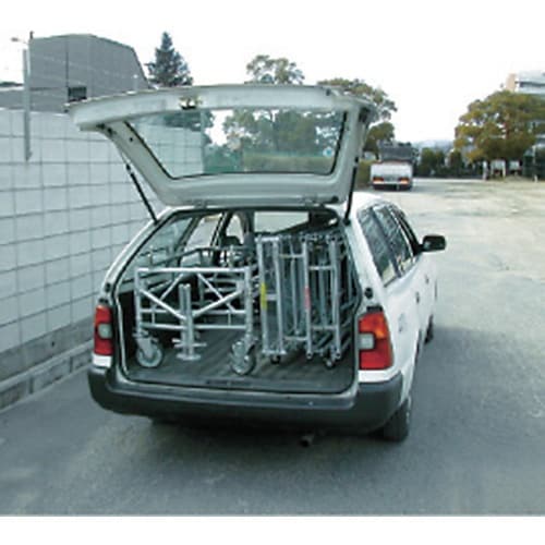軽量かつばねバランス式のため手動で簡単に昇降可能です。作業床を下げ、アウトリガーを折りたたむとコンパクトになりエレベーターなどで移動が可能です。上下ブロック分割で、二人での持ち運びが可能です。 |