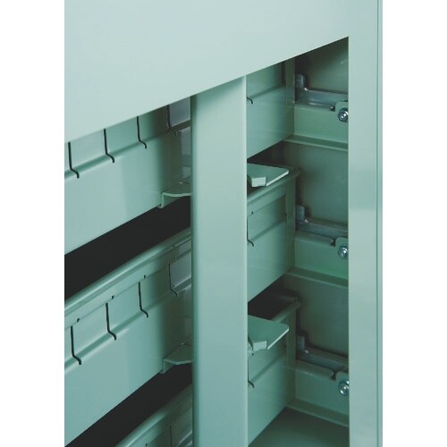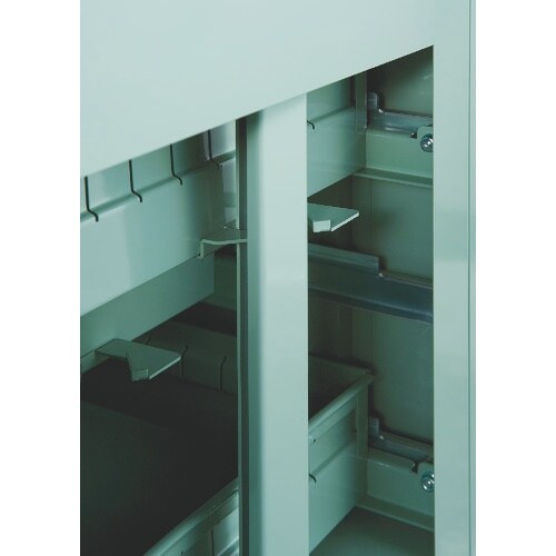 オールロック機構です。各引出しが勝手に出ないようにラッチ機構の安全装置を付けています。セーフティーロック機構付のため引出しを1段開けていると安全機構が働き他の引出しは全てロックされて開きません。 |