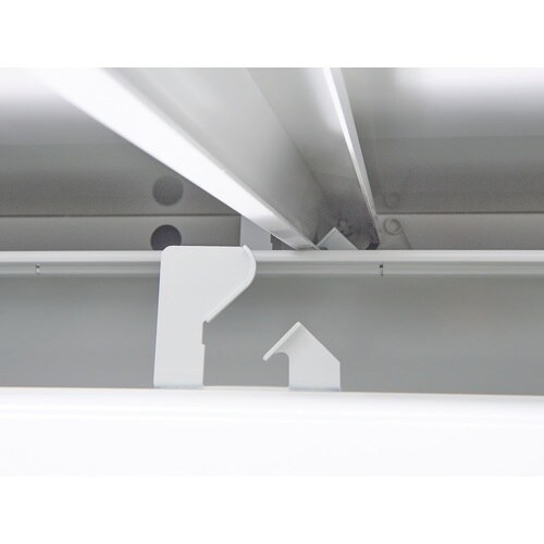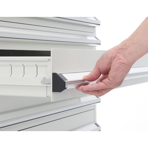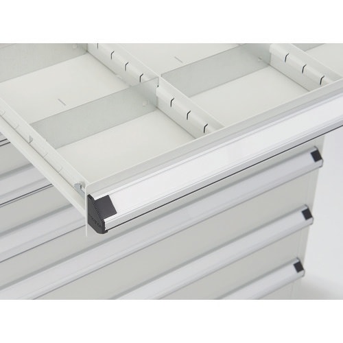 セーフティロック機構付のため引き出しを1段開けていると安全機構が働き、他の引き出しは全てロックされて開きません。オールロック式のため1度にすべての引き出しがロックできます。 |