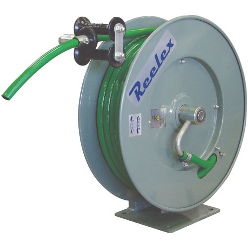 リール本体は衝撃に強い金属製です。りールにカバーがなくホース交換が簡単です。軽くて取り回しの良い水専用塩ビホースを使用しています。工場内等の洗浄、散水に最適です。 |