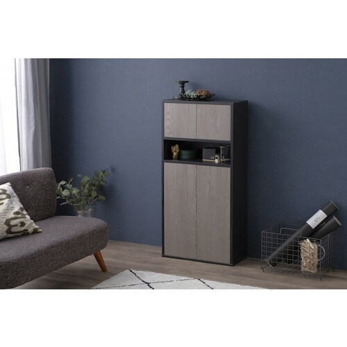 魅せる収納と隠す収納、どちらも兼ね備えたリビングキャビネットです。奥行きがコンパクトで置く場所を選びません。魅せたいものやよく使うものは飾り棚に、書類や小物は扉の中に収納できます。リビングの収納に。 |
