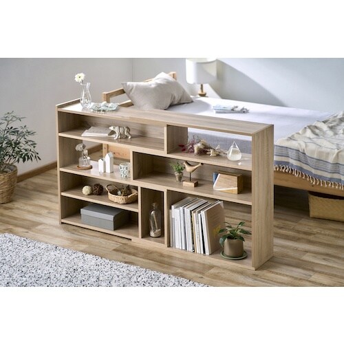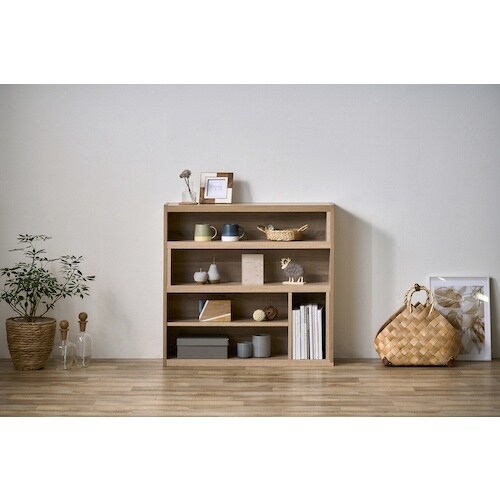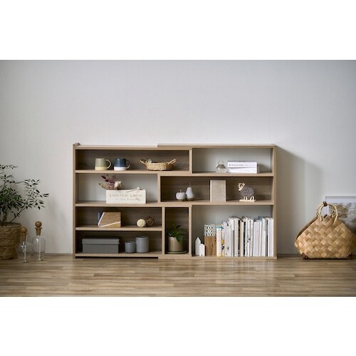 空間に合わせて幅が伸縮可能です。オープンラックで両面使いができ、間仕切りとしても使用可能です。収納するモノに合わせて3段階に高さ調節が可能です。書籍や小物の収納、間仕切りに。 |