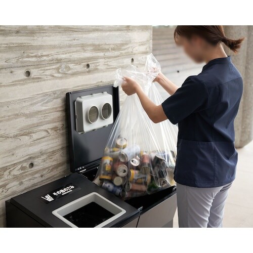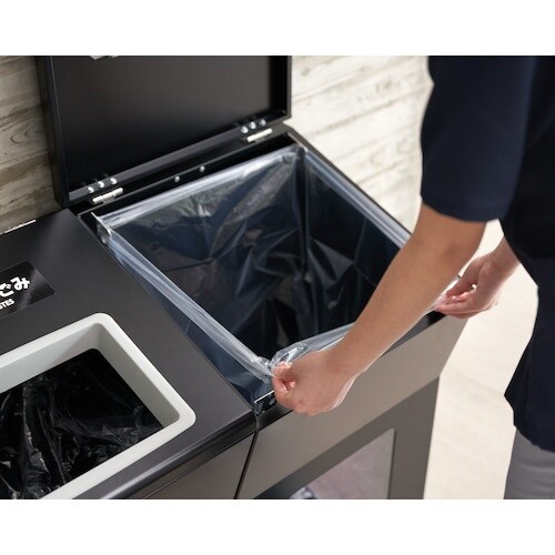 車いすの方や子供でもゴミが入れやすいユニバーサルデザインです。ゴミ袋の交換がカンタンにできる跳ね上げ開閉式タイプ。ゴミ袋をひっかけるだけでセットできます。静かにフタが閉まるトルク機構採用。 |