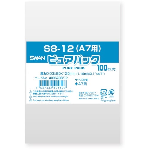 シモジマ スワン OPP袋 ピュアパック テープなし 8−12(A7用) 100枚入り 006798212 1袋(100枚) A04U-8039