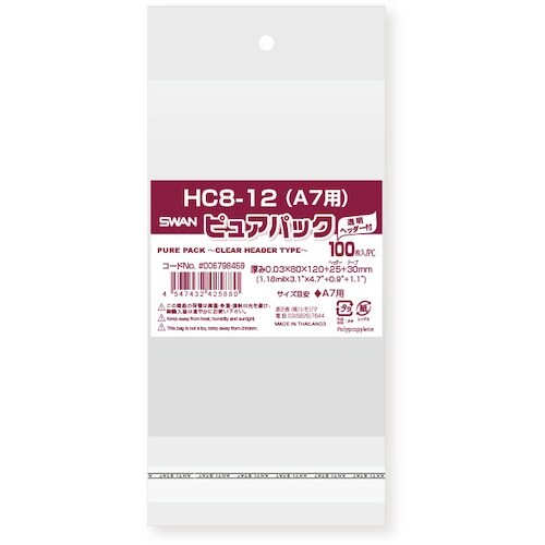 スワン OPP袋 ピュアパック クリアヘッダー付 HC 8−12 (A7用) 100枚入り 006798459 1袋(100枚)