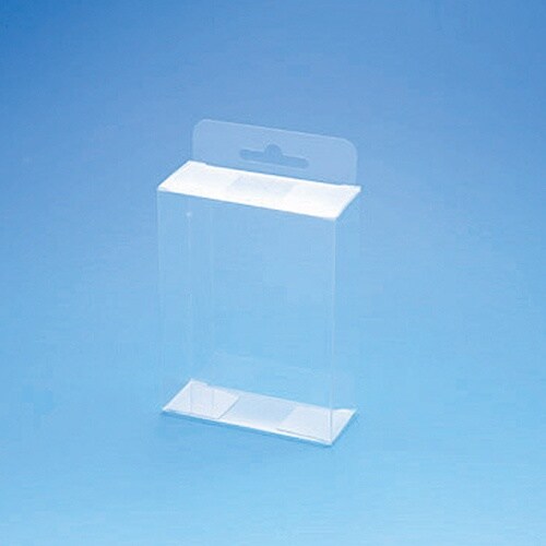 フック等に吊り下げるためのヘッダーが付いた透明ボックスです。組立タイプ。