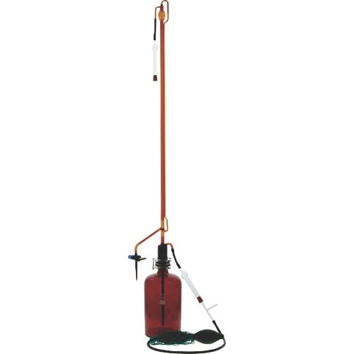 自動ビュレットは、ビュレットに比べ薬液の補充が2連球ゴムスプレーの操作で安全かつ正確に行えます。ゼロ(目盛)が自動的に調整できる構造となっており、ビュレットのゼロ合わせのコック操作の必要がありません。 |