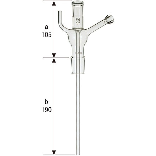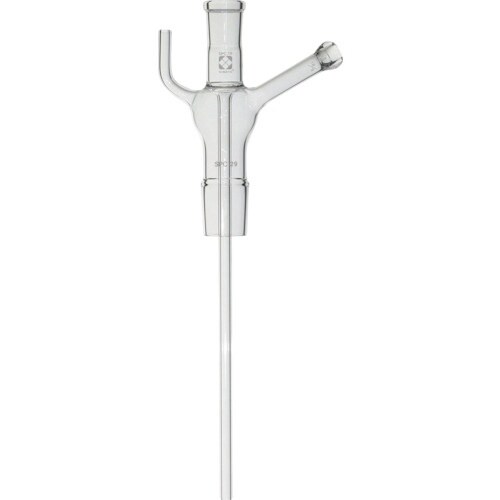 ふっ素イオン水蒸気蒸留装置用のガラス製連結導入管です。上下両端にはSPC規格の接続部があり、側管部には共通球面透明すり合わせとφ8mmの通気管があります。 |