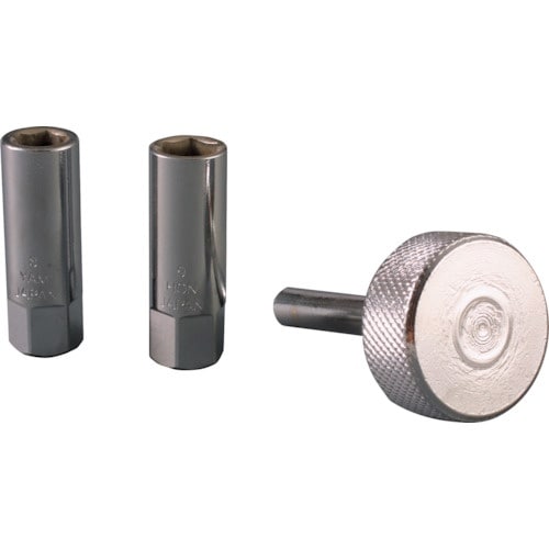 バイクのタペット調整に使用する特殊工具です。ロックナットのサイズに合うソケットを選び、12mmのレンチを使って固定します。ソケット穴からハンドルを挿入し、調整を行います。 |