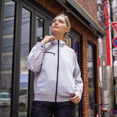 風を逃がさない高密度ポリエステル100%のユニセックス仕様の空調ブルゾンです。裏側背中部分には別売の保冷剤(155×110×25mm)を2個入れられるメッシュポケット付。 |