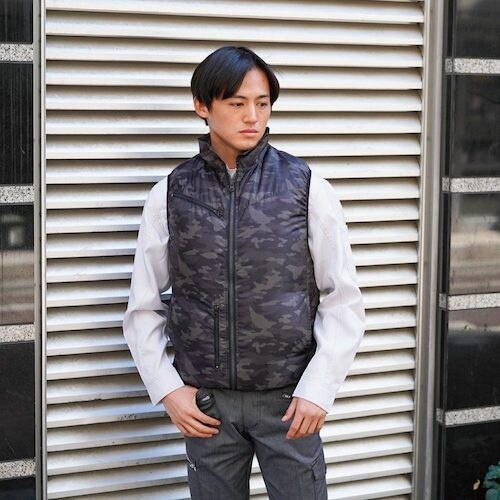 素材に極薄・超高密度ポリエステル100%の日本製生地を採用し、気密性を高めた迷彩柄のカジュアルな着心地のユニセックス仕様の空調ベストです。 |