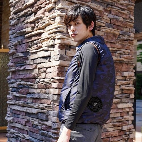 素材に極薄・超高密度ポリエステル100%の日本製生地を採用し、気密性を高めた迷彩柄のカジュアルな着心地のユニセックス仕様の空調ベストです。