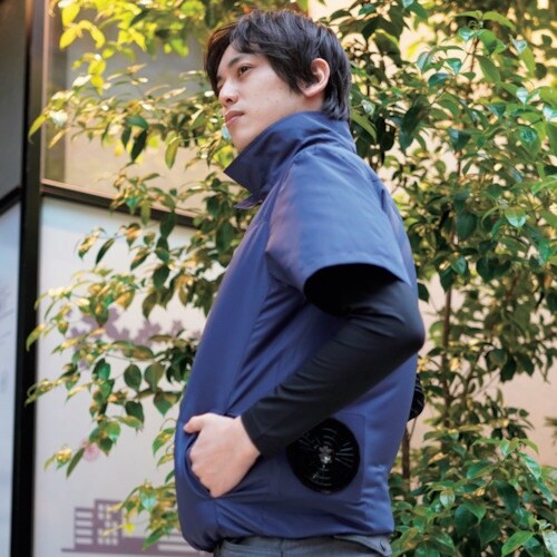 風を逃がさない高密度ポリエステル100%のユニセックス仕様の空調半袖ブルゾンです。熱中症対策に※特に30℃を越える真夏日には別売の保冷剤(OK0911)を併用していただくとより効果が高まります。