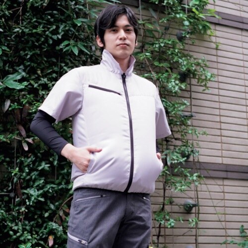 素材に高密度ポリエステルを採用し、気密性を高めたカジュアルな着心地のユニセックス仕様の空調半袖ブルゾンです。