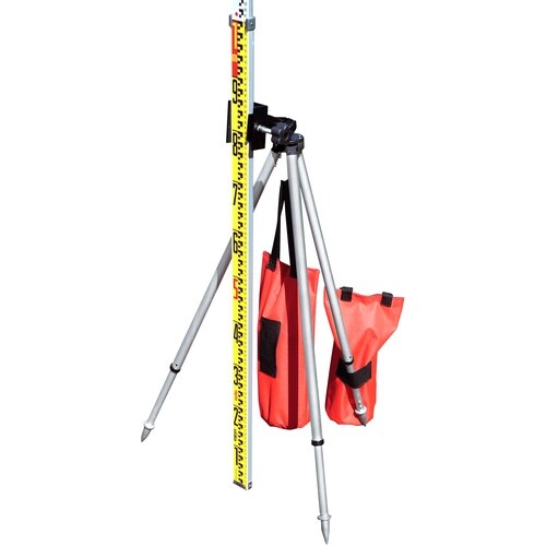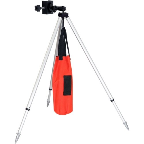 ワンマン測量に便利なスタッフ用三脚です。クランプアームでスタッフの角度調整が可能です。自立の安定性が増す重り下げ袋が2個付属しています。アルミスタッフを垂直自立可能に。 |