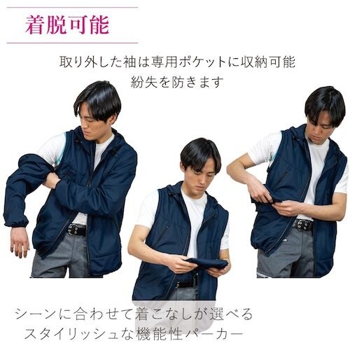 素材にはポリエステル100%生地を採用し、袖はファスナーにより取り外してベストにもなるユニセックス仕様の空調付2Wayパーカーです。