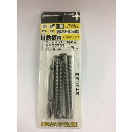 鉄板・H鋼・アングル(全て焼きなし)に対応します。鉄板(SS400)2.3ー9.0mm厚まで下穴なしで鉄板にねじ込めます。専用四角ビット付き。