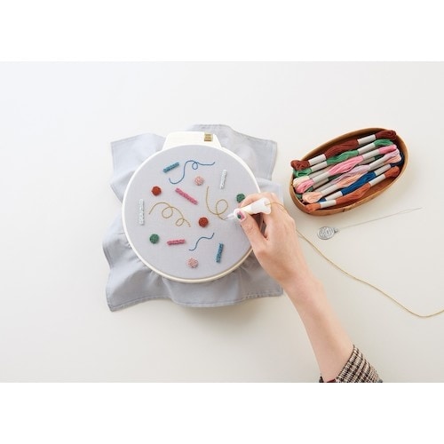 ワンポイント刺しゅうに最適なフリーステッチングが楽しめる道具が揃ったセットです。イラストを描く様にステッチが刺せます。刺しゅうを楽しめるスターターセットです。 |